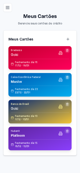 "A gestão de cartões é incrível! Consigo ver todas as parcelas e sempre recebo alerta dos vencimentos."